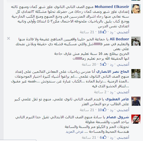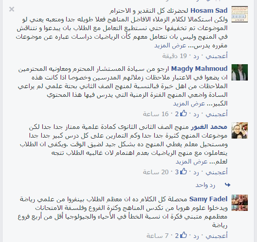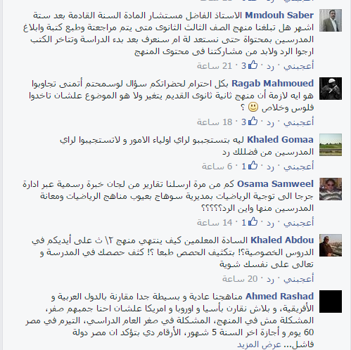 وأضاف ممدوح صابر " الاستاذ الفاضل مستشار المادة السنة القادمة بعد ستة اشهر هل تبلغنا منهج الصف الثالث الثانوى متى يتم مراجعتة وطبع كتبة وابلاغ المدرسين بمحتواة حتى نستعد لة ام سنعرف بعد بدء الدراسة وتتاخر الكتب ارجوا الرد ولابد من مشاركتنا فى محتوى المنهج".