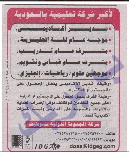 تعلن احدى الشركات التعليمية الكبرى بالمملكة العربية السعودية عن حاجتها الى موجهين ومشرفين تعليم ومديرى اكاديمية، وعلى الراغبين فى التقدم التواصل من خلال الاعلان التالى: