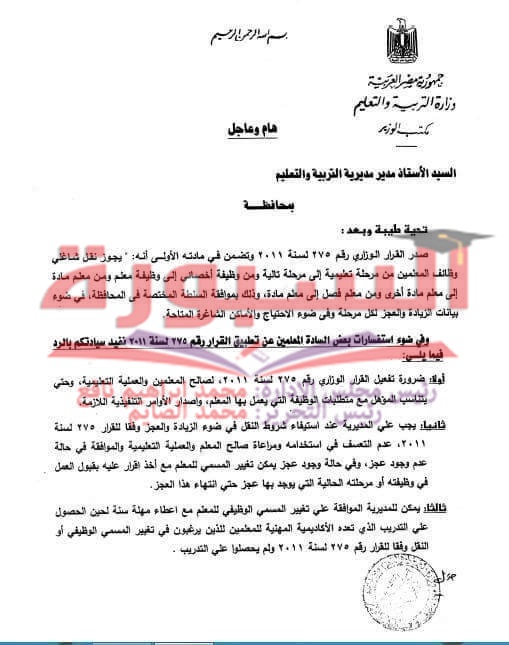 أعلنت وزارة التربية والتعليم عن جواز نقل شاغلى وظائف المعلمين من مرحلة تعليمية الى مرحلة تالية، ومن وظيفة اخصائى الى وظيفة معلم، ومن معلم الى معلم مادة أخرى، ومن معلم فصل الى ملعم مادة، وذلك بموافقة السلطة المختصة فى المحافظة فى ضوء بيانات الزيادة والعجز لكل مرحلة وفى ضوء الاحتياج والاماكن الشاغرة المتاحة.