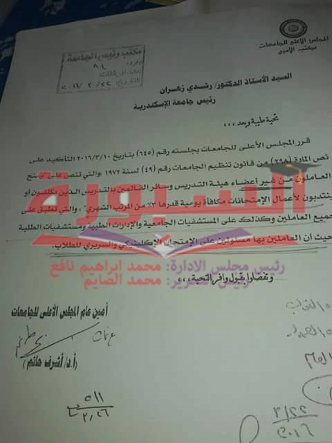 قرر المجلس الاعلى للجامعات بجلسته رقم (645) بتاريخ 10 مارس 2016 التأكيد على نص المادة (298) من قانون تنظيم الجامعات رقم (49) لسنة 1972، والتى تنص على "يمنح العاملون من غير اعضاء هيئة التدريس وسائر القائمين بالتدريس الذين يكلفون أو ينتدبون لأعمال الامتحانات مكافأة يومية قدرها 3% من المرتب الشهرى، والتى تطبق على جمبع العاملين، وكذلك على المستشفيات الجامعية والادارات الطبية ومستشفيات الطلبة، حيث أن العاملين بها مسئولين على الامتحان الاكلينيكى والسريرى للطلاب".