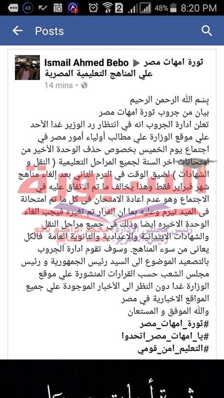 جاء ذلك فى بيان على صفحة "ثورة أمهات مصريات" على موقع التواصل الاجتماعى "فيسبوك"، حيث أضاف البيان أن الدكتور الهلالى الشربينى، وزير التربية والتعليم والتعليم الفنى، وعد أولياء الأمور فى اجتماع يوم الخميس الماضى بالغاء اجزاء من المناهج لجميع المراحل التعليمية، إلا أن موقع الوزارة قام بنشر اعتبار دروس شهر فبراير مواد لا يتم الامتحان فيها مرة أخرى فقط، وهذا يعتبر مخالفا لما وعد به الهلالى.