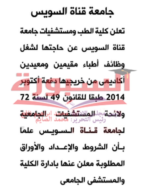 تعلن جامعة قناة السويس عن وظائف شاغرة لأعضاء هيئة التدريسوذلك في التخصصات التالية: