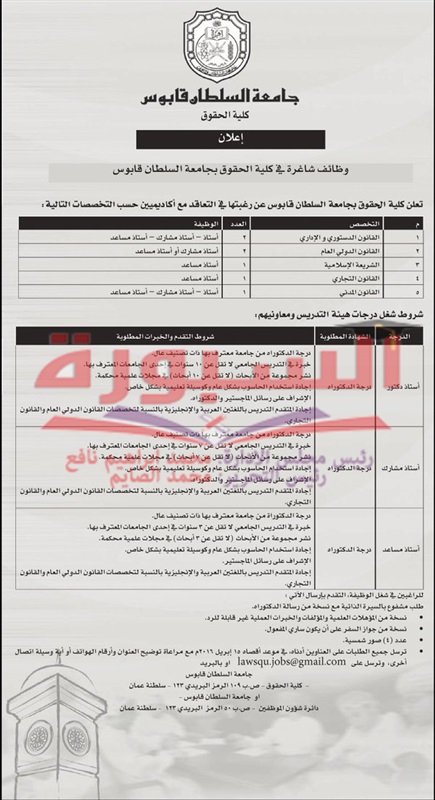 تعلن جامعة السلطان قابوس بسلطنة عمان عن حاجتها الى اعضاء هيئة تدريس، وعلى الراغبين فى التقدم ارسال السيرة الذاتية على الايميل التالى: [email protected]