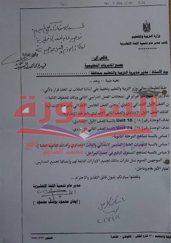 وجاء نص الفاكس على حذف الوحدة رقم 18 من الصف الاول الاعدادى وحذف الوحدة 24 من الصف الثانى الاعدادى، وتم التأكيد بعدم المساس بمناهج الصفوف للمرحلة الثانوية او الشهادات العامة الابتدائية والاعدادية والثانوية، وكذلك عدم التعرض لمواد المستوى الرفيع فى جميع المواد والفاكس صادر بتاريخ اليوم 4 أبريل 2016.
