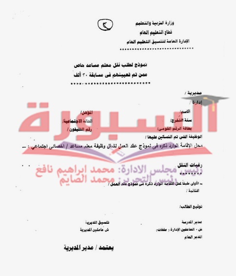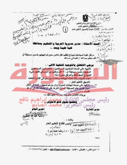 أرسلت وزارة التربية والتعليم فاكساً الى مديريات التربية والتعليم والادارات التعليمية بشان "نقل المعلمين والاخصائيين المساعدين بمسابقة 30 الف معلم مساعد" والراغبين فى النقل الى محافظاتهم وذلك من خلال نموذج وطلب نقل يقوم المعلم والاخصائى المساعد بمسابقة 30 الف معلم مساعد بملئ البيانات به وان يتم ابلاغ قطاع التعليم العام الاداراة العامة لتنسيق التعليم العام ببيانات المعلمين المساعدين الراغبين فى النقل وذلك فى موعد نهايتة 21 / 4 / 2016 على ان يتم ذلك من خلال اعداد كشوف باسماء وبيانات كاملة لجميع المعلمين والاخصائيين المساعدين الراغبين فى النقل بدقة.