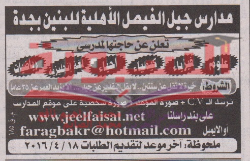 تعلن مدرسة جيل الفيصل الاهلية بجدة بالمملكة العربية السعودية عن حاجتها الى معلمين فى جميع التخصصات، علما بان آخر موعد للتقديم 18 أبريل 2016، ولمزيد من التقاصيل عبر الاعلان التالى