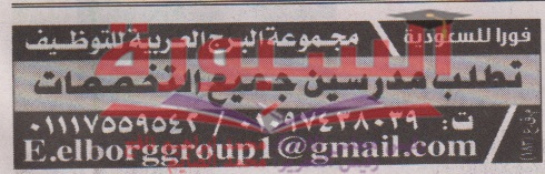 أعلنت مجموعة البرج العربية للتوظيف عن حاجتها الى معلمين فى جميع التخصصات للعمل فى المملكة العربية السعودية، وعلى الراغبين فى التقدم ارسال السيرة الذاتية أو التواصل عبر الاعلان المنشور فى جريدة الاهرام اليوم الجمعة الموافق 2016/4/8.