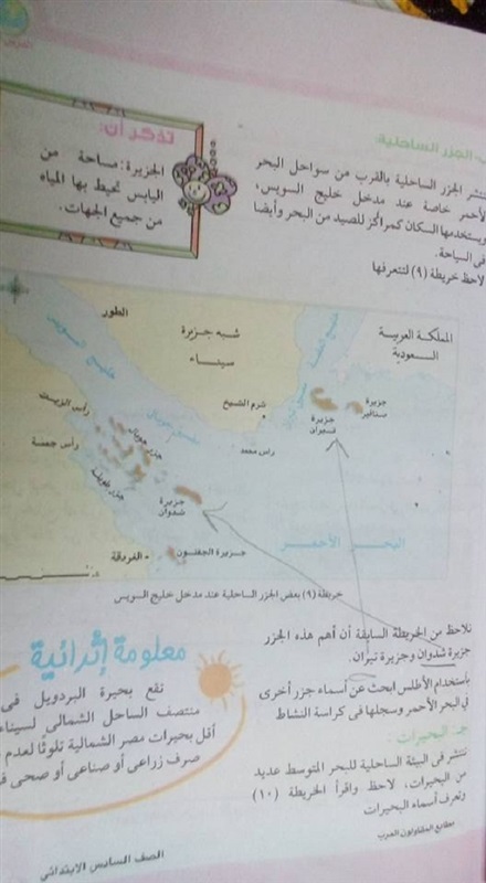 بالصور : منهج سادسة ابتدائي يفضح بيان "الحكومة "تيران وصنافير مصريتان