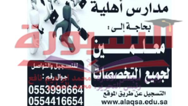 عاجل.. مطلوب معلمين فى جميع التخصصات بمدارس الاقصى الاهلية بالسعودية.. ننشر الشروط والتفاصيل