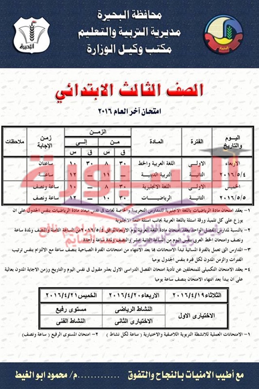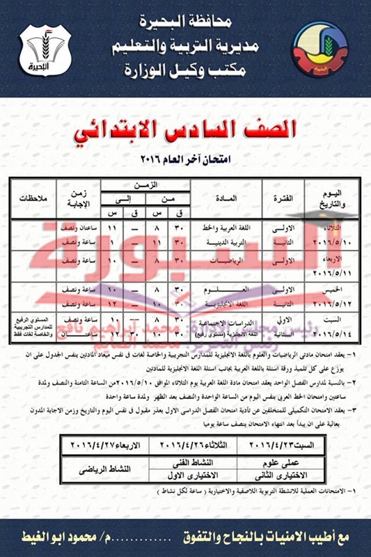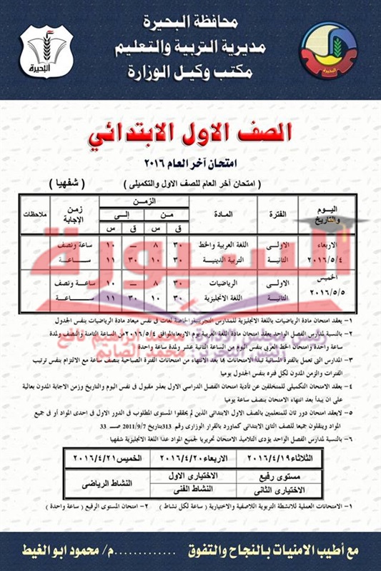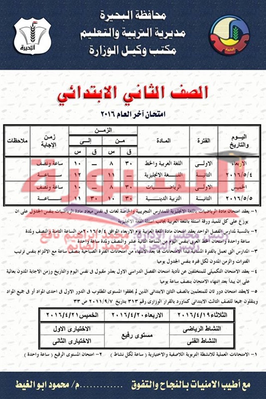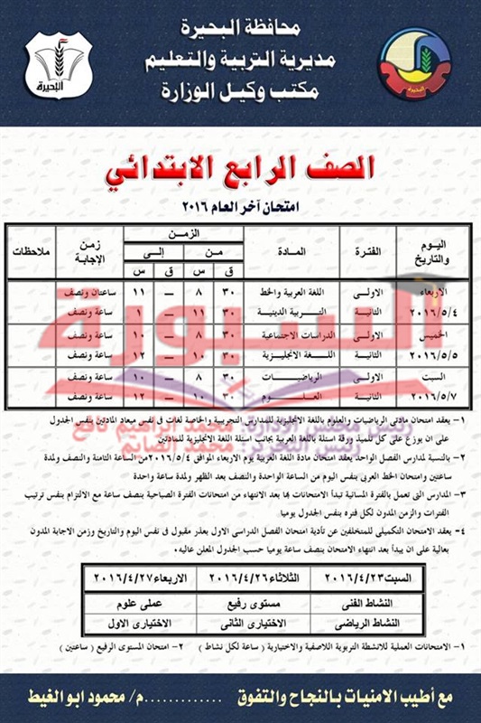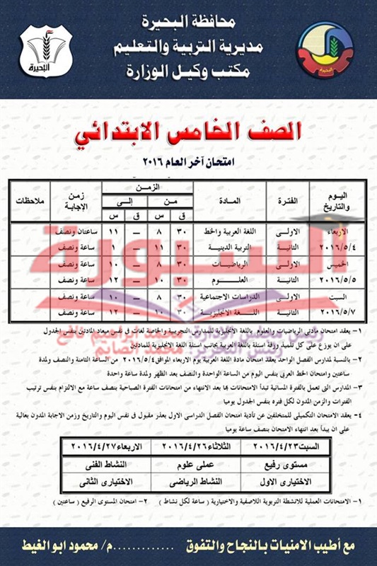 جداول امتحانات النقل والشهادة الابتدائية بالبحيرة