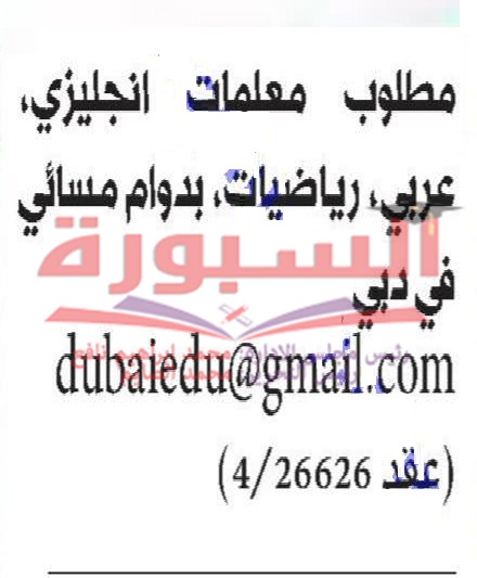 تعلن مدرسة خاصة إمارة دبي في دولة الامارات العربية المتحدة عن حاجتها للتعاقد مع معلمين ومعلمات وذلك في التخصصات التالية: