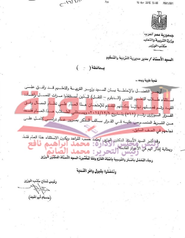 وافق الدكتور الهلالى الشربينى، وزير التربية والتعليم والتعليم الفنى على استثناء طلاب التعليم الفني ( الدبــــلوم - النقــــل ) الذين استنفذوا مرات الفصل وإعادة القيـــــد وتم فصلهم نهائيـــــا يمكنهم التقــــدم للامتحان هـذا العـام على نظام العمال وفق القرار الوزاري رقم 562 بتاريخ 9/12/2014 ويستثنى الطلاب هذا العام فقط من الشرط المنصوص عليه في القرار سالف الذكر بمرور عام دراسي كامل على نجاحهم في الصف السابق.