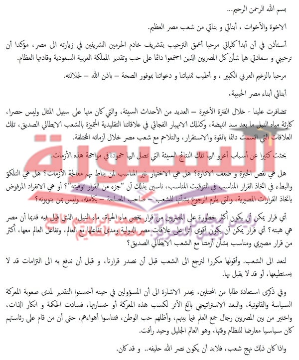 وفي بداية البيان رحب الفريق "أحمد شفيق" بزيارة الملك "سلمان" لمصر، ثم علق على أزمة مياه النيل، والتوتر القائم بين مصر وإيطاليا، مرجعا أسباب النتائج السيئة، التي وصلت إليها الأزمتين، إلى نقص الخبرة، وضعف الإدارة، والاختيار غير المناسب لمن يناط بهم معالجة الأزمات، والتلكؤ والبطء في اتخاذ القرار المناسب في التوقيت المناسب.