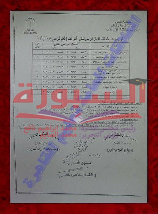 أعلنت مديرية تعليم القاهرة مقترح بمواعيد امتحانات الفصل الدارسي الثاني ( آخر العام ) للعام الدراسي 2015/2016، حيث تبدأ يوم الأربعاء الموافق 26/4/2016 وتنتهي يوم الخميس الموافق19/5/2016