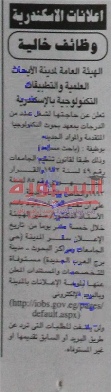 تعلن مدينة الأبحاث العلمية بالاسكندية عن وظائف شاغرة لأعضاء هيئة التدريس وذلك في التخصصات التالية: