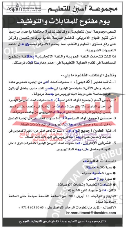 مدارس آسبن الاماراتية تعلن عن وظائف شاغرة للمعلمين
