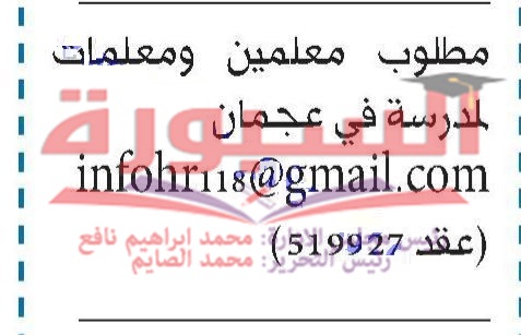 تعلن مدرسة خاصة في إمارة عجمان بدولة الامارات العربية المتحدة تعلن عن وظائف شاغرة للمعلمين والمعلمات في جميع الواد وذلك وفقا للشروط التالية: