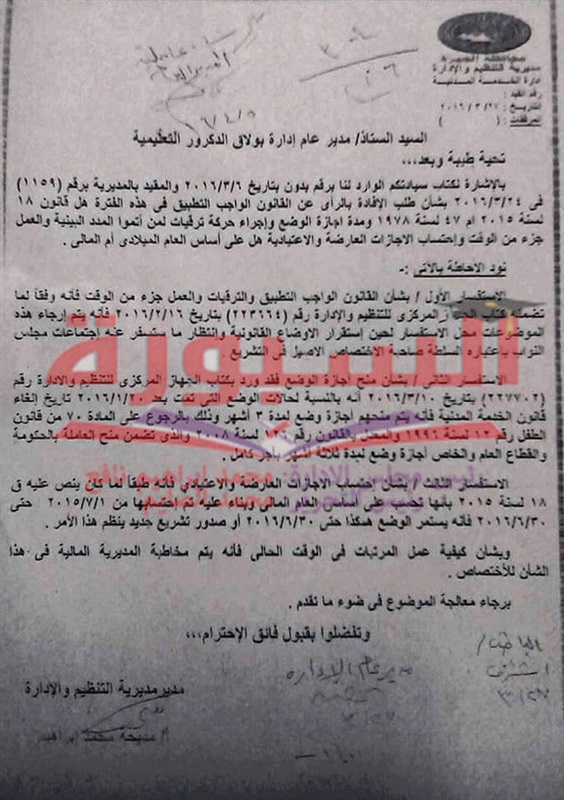 بالمستندات| تعرف على رد التنظيم والادارة بشأن الأجور والمرتبات للمعلمين والإجازات العارضة والوضع