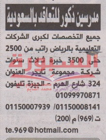 مطلوب مدرسين ذكور للتعاقد مع السعودية برواتب 2500:3500 ريالا، منشور فى الأهرام 15-4-2016 لكبرى الشركات التعليمية بالرياض .