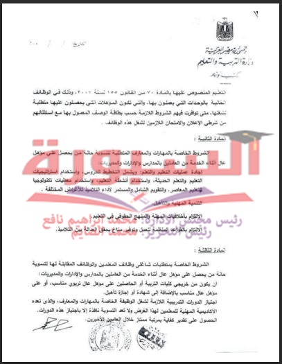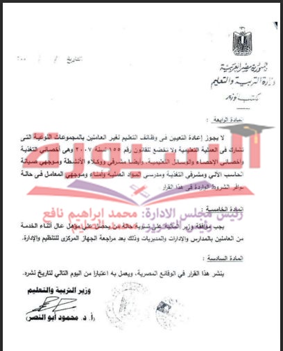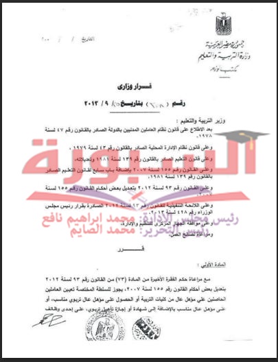 ننشر القرار الوزارى بأحقية الحاصلين على مؤهل عاٍل أثناء الخدمة بالاشتغال فى وظيفة معلم بالتربية والتعليم
