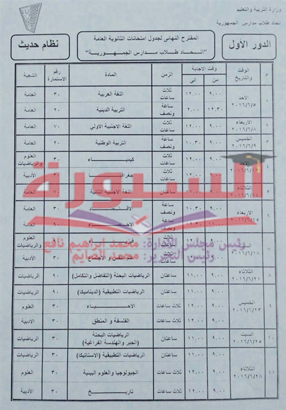 اعلن اتحاد طلاب مصر عن موافقة الدكتور الهلالى الشربينى وزير التربية والتعليم والتعليم الفنى على مقترح الطلاب بشأن جدول امتحانات الثانوية العامة للعام الدارسى 2015/2016، جاء ذلك على صفحة اتحاد طلاب مصر.