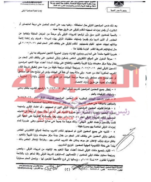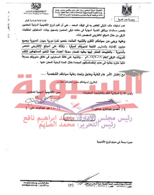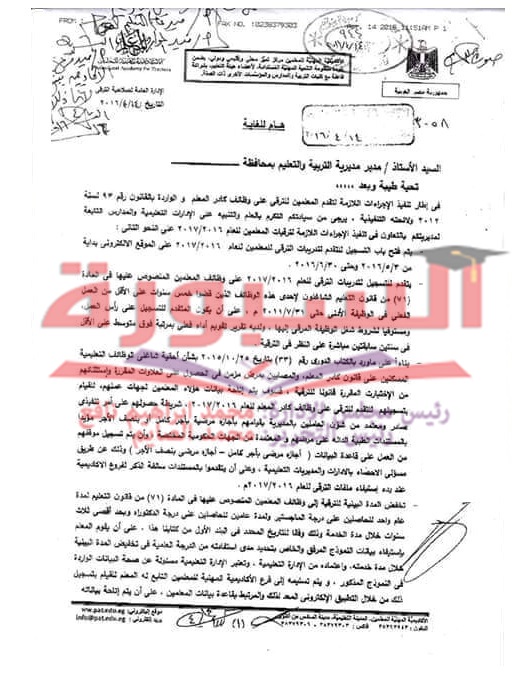 بعثت الاكاديمية المهنية للمعلمين الى جميع مديريات التربية والتعليم بمحافظات الجمهورية فاكساً بشان الاجراءات اللازمة لتقديم المعلمين لترقيتهم على وظائف كادر المعلم وضرورة ابلاغ جميع الادارات التعليمية والمدارس التابعة لها فى تنفيذ الاجراءات اللازمة لترقيات المعلمين للعام الجديد 2016 / 2017 وسيتم اتباع الخطوات التالية : -