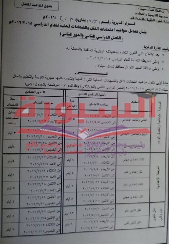 ننشر.. جداول امتحانات شمال سيناء اخر العام.. "بعد التعديل"