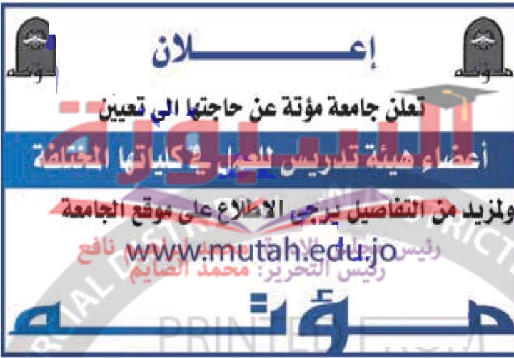 تعلن جامعة مؤتة عن وظائف شاغرة لأعضاء هيئة التدريس بجميع الكليات"من معيد الي أستاذ"