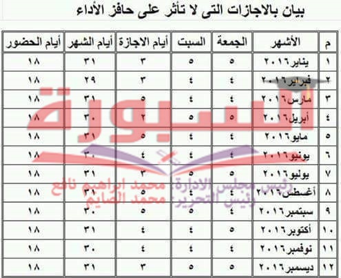 ينشر موقع السبورة التعليمى بيان بالاجازات التى تؤثر على حافز الآداء، ولابد من حضور المعلم 18 يوما فى كل شهر، ولدينا جدول كامل بعدد أشهر العام، والتى يوضح عدد أيام الحضور والإجازات.