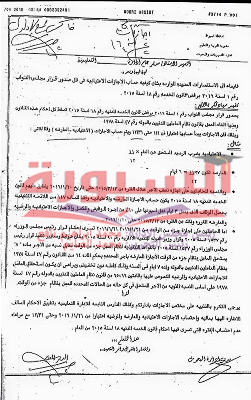 ينشر موقع السبورة التعليمى الفاكس المرسل من وزارة التربية والتعليم الى المديريات التعليمية عن كيفية احتساب الاجازات العارضة والاعتيادية لجميع المعلمين بعد الغاء العمل بقانون رقم 18لسنة 2015 .