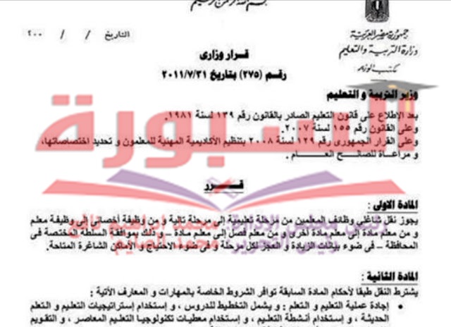 1- وقف العمل بالقرار الوزارى ( تغيير المسمى الوظيفى ) رقم 275 بتاريخ 31 / 7 / 2011 بصفة مؤقتة لحين انتهاء الادارات العامة للتنسيق بالوزارة من دراسة الاحتياجات الفعلية اللازمة لنقل وندب اعضاء هيئة التعليم