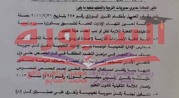 3- تشكيل لجنة بكل مديرية تعليمية واخرى على مستوى كل ادارة تعليمية تتثمثل فى – لجنة بكل ادارة تعليمية برئاسة مدير الادارة التعليمية – لجنة بكل مديرية تعليمية برئاسة مدير المديرية وفى سياق ذلك ضرورة الانتهاء من كافة الاجراءات الخاصة باعادة التوزيع اعضاء هيئة التعليم فى مدة اقصاها نهاية شهر يوليو 2016 على ان يتم التنفيذ فعلياً قبل نهاية شهر اغسطس 2016