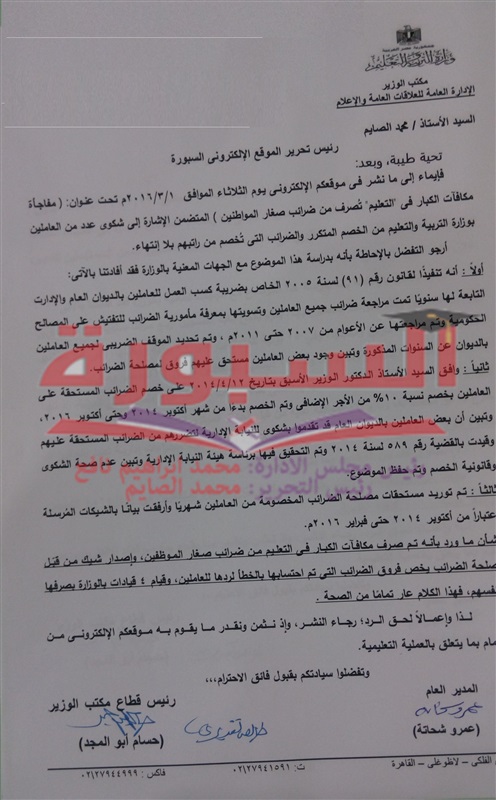 أكدت وزارة التربية والتعليم أنها قامت بالتحقيق في واقعة" التعليم تكشف حقيقة صرف مكافأت الكبار بالوزارة من ضرائب صغار المواظفين" والتي قامت "السبورة" بنشرة بتاريخ 1 مارس 2016.