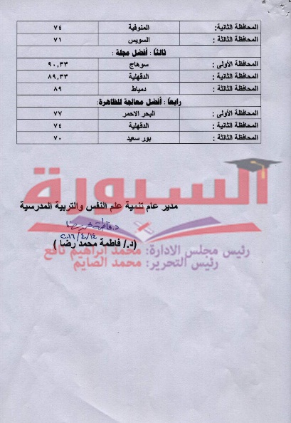 تنشر "السبورة" نتيجة مسابقة التربية النفسية للعام الدراسي 2015 / 2016 والتي جات كالتالي: