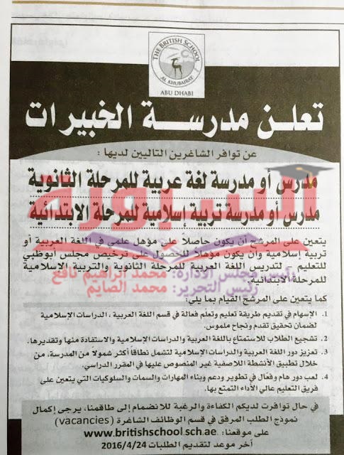 تعلن مدرسة الخبيرات بدولة الامارات عن جاحتها الى معلمين ومعلمات للمرحلتين الثانوية والابتدائية، ولمزيد من التفاصيل على الاعلان التالى: