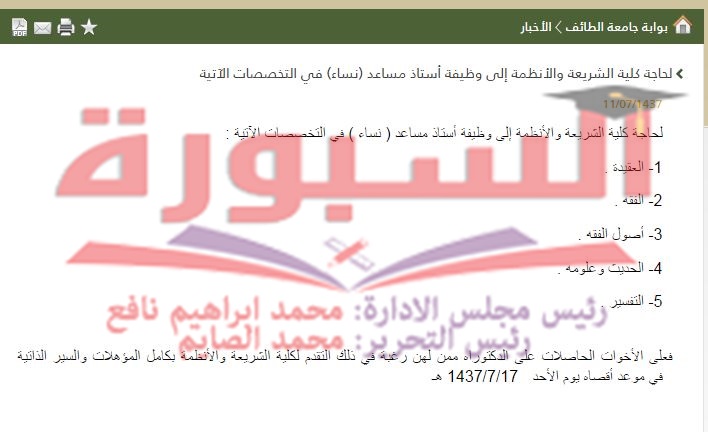 تعلن كلية الشريعة والأنظمة بجامعة الطائف عن توفر وظائف أكاديمية شاغرة بدرجة أستاذ مساعد ( للنساء ) في التخصصات الآتية :