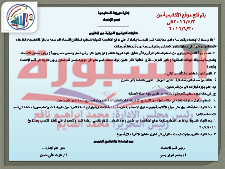 ينشر موقع السبورة التعليمى خطوات الترشيح لترقية المعلمين عن المدارس، والحقوق والواجبات التى يجب ان يتبعها المعلم فى حال عدم ذكر اسمه للترقية من قبل الاكاديمية المهنية للمعلمين مع أحقيته فى الترقية.