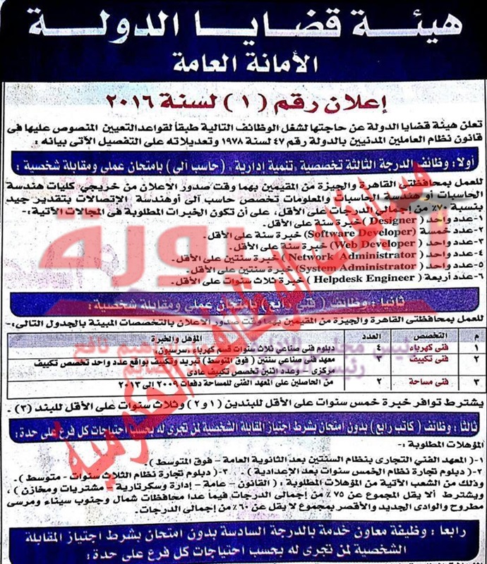 اعلنت هيئة قضايا الدولة عن حاجتها الى وظائف للمؤهلات العليا والدبلومات والابتدائية ومحو الامية فى جميع المحافظات.