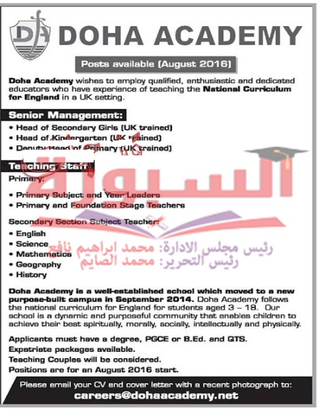 تعلن اكاديمية الدوحة بدولة قطر عن حاجتها الى مديرى مدارس وروضات ومعلمين للمرحلتيت الابتدائية والثانوية، وعلى الراغبين فى التقدم ارسال السيرة الذاتية على الايميل التالى [email protected]