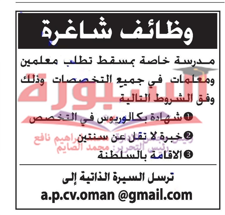 تعلن مدرسة خاصة في سلطنة عمان عن حاجتها للتعاقد مع معلمين في جميع المواد وذلك وفقا للشروط التالية :