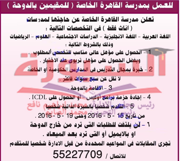 تعلن مدرسة خاصة بدولة قطر عن حاجته عن وظائف شاغرة للمعلمين وذلك في التخصصات التالية: