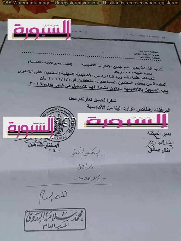 فاكس الاكاديمية بشأن فتح باب التسجيل للمعلمين المساعدين المتعاقدين فى 2014/4/1 أول يونيو المقبل