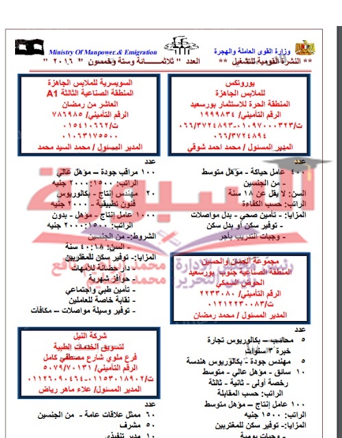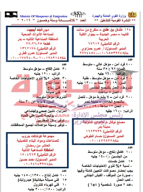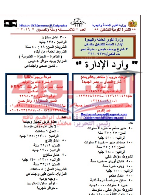 أعلنت وزارة القوي العاملة والهجرة عن وجود 13 ألف وظيفة خالية لمختلف المؤهلات الدراسية وبمختلف المؤسسات وشركات القطاع الخاص ونشرت تفاصيل ذلك من خلال النشرة الشهرية و الدورية التي تقوم الوزارة بحصرها وقد نشرت الوزارة الوظائف الجديدة اليوم 25/4/2016 .