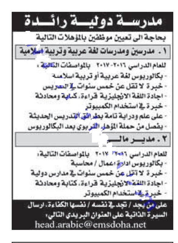 تعلن مدرسة دولية رائدة بدولة قطر عن حاجتها الى معلمين ومعلمات، ولمزيد من التفاصيل فى الاعلان التالى: