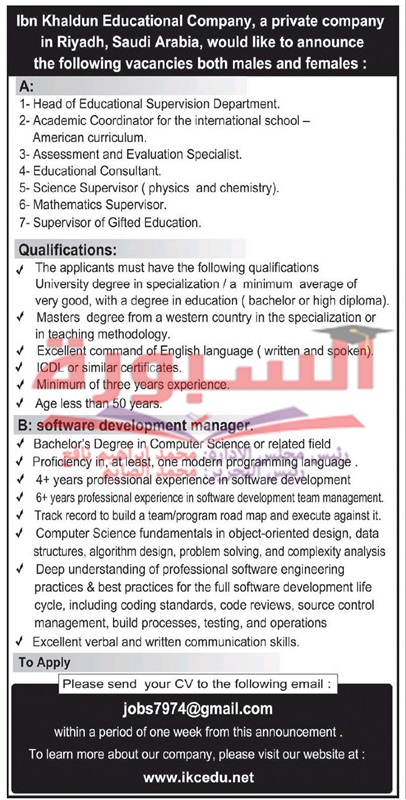 تعلن شركة ابن خلدون التعليمية عن حاجتها الى وظائف تعليمية وبرمجية، وعلى الراغبين فى التقدم للوظائف ارسال السيرة الذاتية على الايميل التالى: [email protected]، ولمزيد من التفاصيل فى الاعلان التالى والذى تم نشره فى جريدة الاهرام.