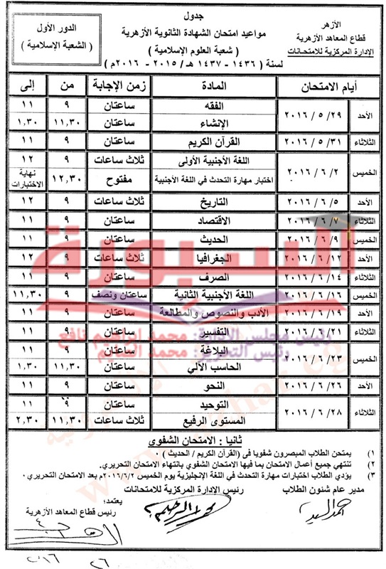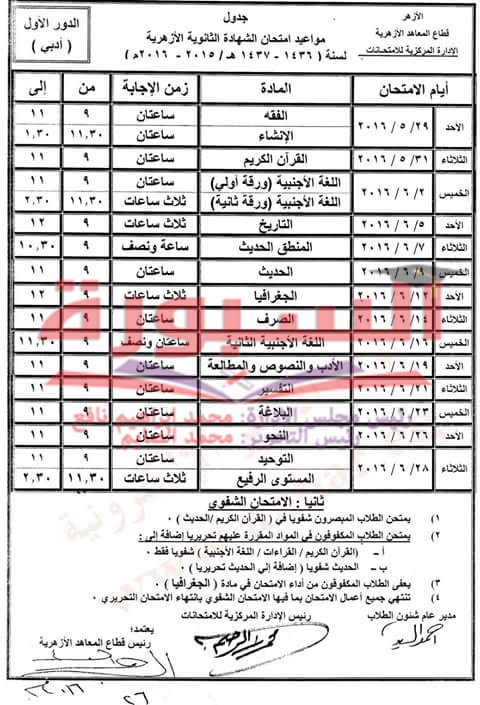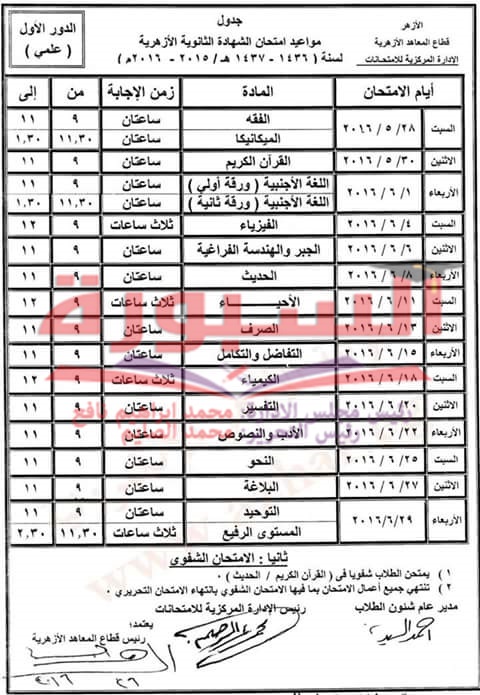 اعلن قطاع المعاهد الازهرية اليوم الأربعاء عن جداول امتحانات الثانوية الأزهرية والتى سوف تبدأ فى 28 مايو، وتنتهى 29 يونيو المقبل.