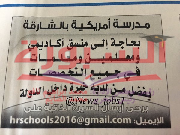 تعلن مدرسة امريكية بامارة الشارقة بالامارت العربية المتحدة عن حاجتها الى معلمين ومعلمات فى جميع التخصصات، ولمزيد من التفاصيل فى الاعلان التالى: