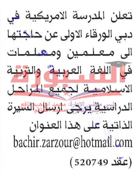تعلن المدرسة الأمريكية في دبي بدولة الامارات العربية المتحدة عن حاجتها للتعاقد مع معلمين ومعلمات وذلك في التخصصات التالية: