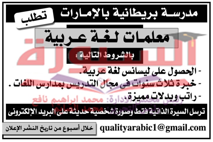 تعلن مدرسة بريطانية بالامارات عن حاجتها الى معلمات لغة عربية، ولمزيد من التفاصيل فى الاعلان التالى: