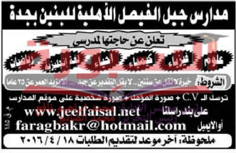 تعلن مدارس جيل الفيصل بجدة في المملكة العربية السعودية عن وظائف شاغرة للمعلمين وذلك في المواد لتالية